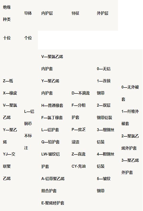 用漢語(yǔ)拼音第一個(gè)字母的大寫表示導(dǎo)體材料、絕緣種類、內(nèi)護(hù)層材料和結(jié)構(gòu)特點(diǎn)。